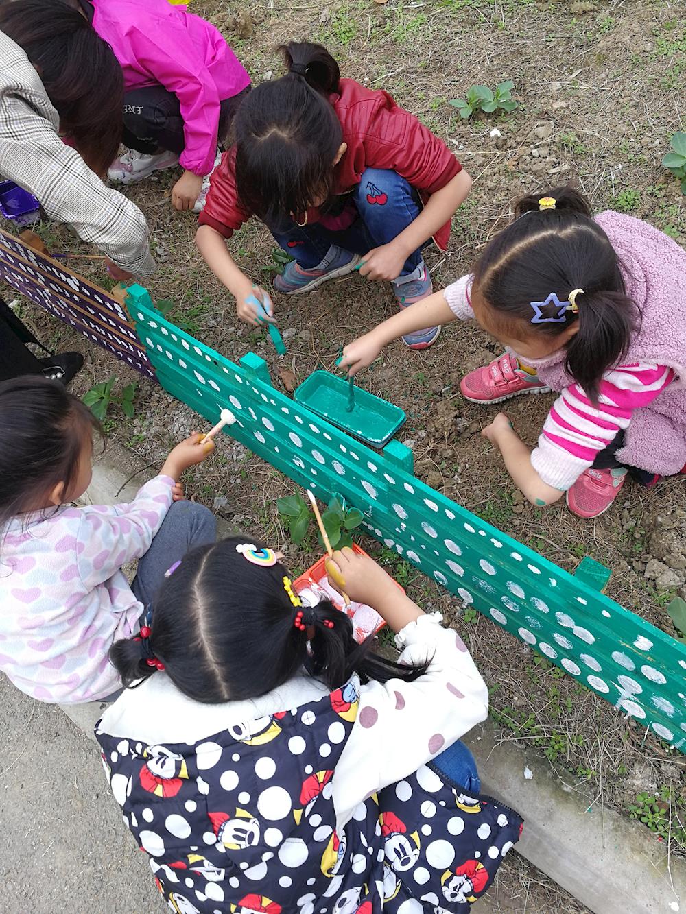 听着孩子的建议我们请废弃的小床板变成了小篱笆。孩子们以年级组为单位一起设计、围合、铺路……